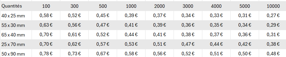 Prix pour 10000 pièces (taille : 40 x 25 mm)