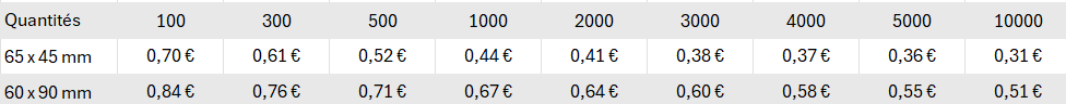Prix pour 10000 pièces (taille : 65 x 45 mm)